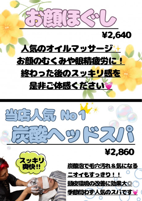 他にも色々なメニューがございますので気になる方はお気軽にスタッフにお声がけください(*^^*)